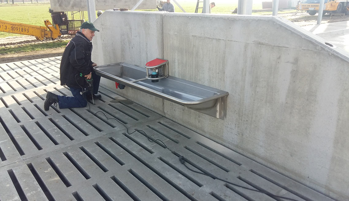 - Vlotter in het midden. Uit de praktijk blijkt dat koeien vanaf de zijkant uit de waterbak drinken.